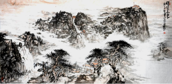 赵德勋这边却迥然不同,笔下是一幅刚起势便精工细琢的山水画。线条交错搭配之处勾勒着山间万物,笔墨虚实结合之间蕴含着无限风光。虽只有墨色单一呈现,但白云苍松、山光水色、远近高低让人一眼便能识出大概。方方正正的台阶和房屋线条穿插其中毫不突兀,色彩在画幅各个角落涌现、补充、丰富,晚霞映衬群山、群山耸立云间,原来是一幅收纳五岳之尊雄伟气势于四尺之中的《雄峙天东》。