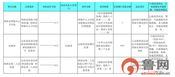据悉,利津县第二人民医院因口腔CT室工作指示灯不符合要求被处以警告,责令限期整改的处罚;利津县明集卫生院因未按规定存放医疗废物,被处以警告,责令限期整改的处罚;纪海青因非医师行医,被处以罚款4000元,没收违法所得300元,没收药品器械的处罚。