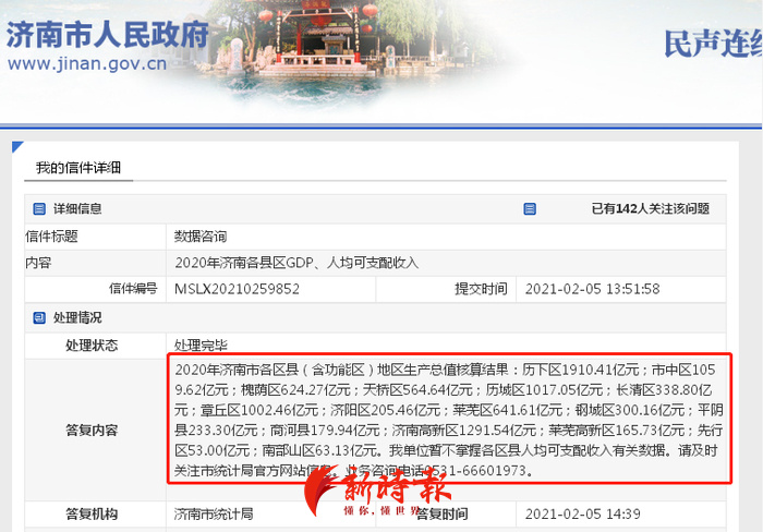2月5日,济南有市民在市政府网“民生连线”栏目中咨询“2020年济南各县区GDP、人均可支配收入”的问题,当天得到济南市统计局回应。数据显示,2020年度济南市共有5区(含功能区)GDP破千亿元,分别为历下区、高新区、市中区、历城区和章丘区,其中历下、高新、市中位居前三位;作为“东强”的主阵地,4个过千亿元的区县位于“东强”实施范围内,其中历城区生产总值首破千亿,为1017.05亿元。