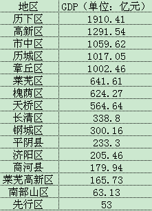 根据济南市统计局提供的数据,2020年度GDP超过千亿元的区(含功能区)分别是:历下区1910.41亿元,高新区1291.54亿元,市中区1059.62亿元,历城区1017.05亿元,章丘区1002.46亿元。5个区GDP总量合计6281.08亿元,占济南市全年GDP总量的61.9%。