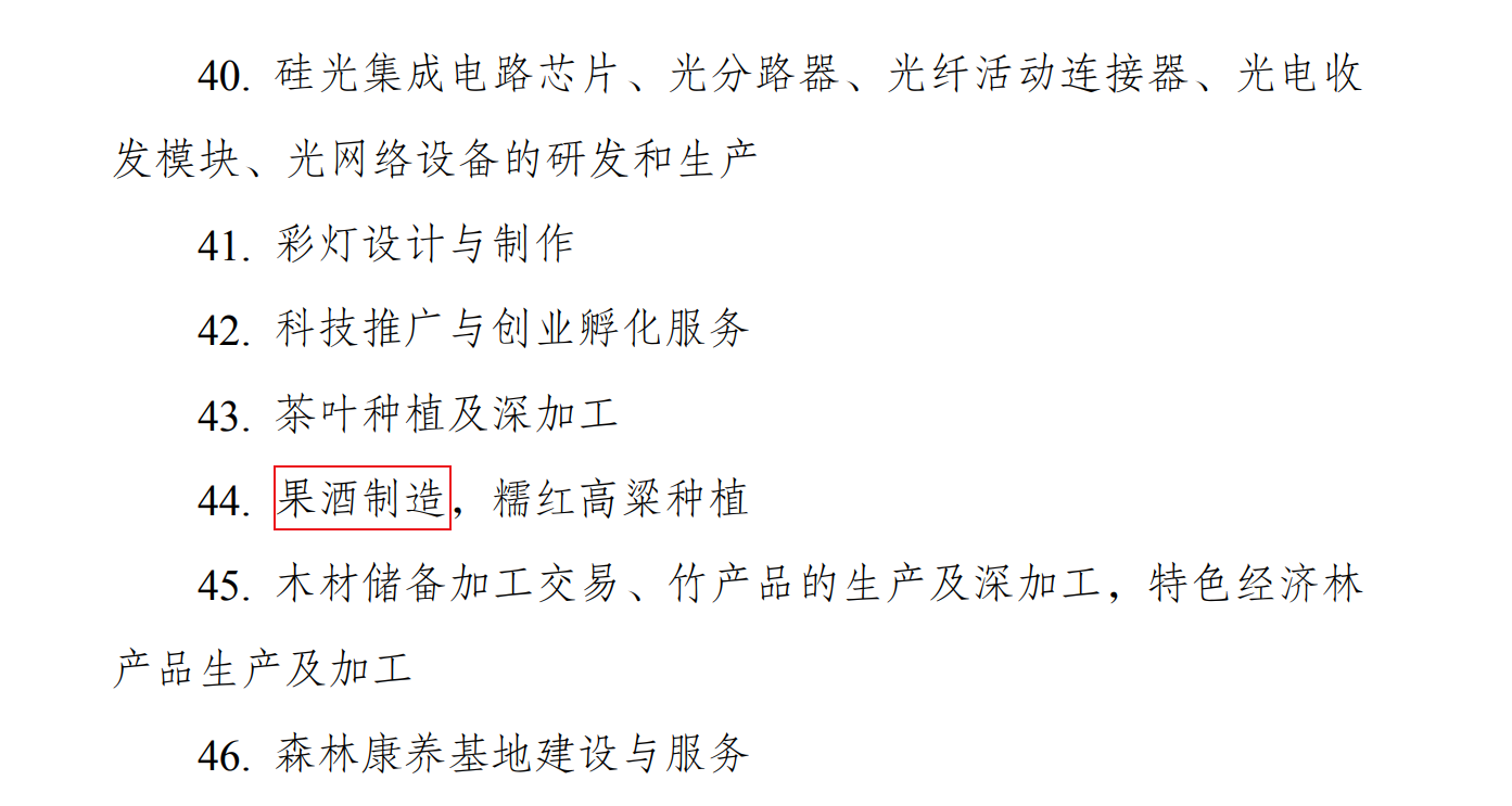 日前,新京报记者在国家发展和改革委员会官网了解到,其发布的《西部地区鼓励类产业目录(2020年本)》将自2021年3月1日起施行。其中,“果酒制造”被列入西部地区新增鼓励类产业中。而上一版本的该目录是在2014年起实行,在该条例中,并不见“果酒制造”字眼,只有一条“枸杞制品”中涵盖了一项“枸杞果酒”。国家发展改革委有关负责人称,对西部地区鼓励类产业企业减按15%的税率征收企业所得税,《西部地区鼓励类产业目录》界定了西部大开发企业所得税优惠政策适用的产业范围,是企业能否享受该政策的重要依据。