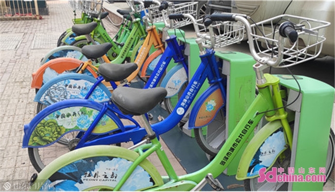 在一处公共自行车停放点,停放的公共自行车后轮都印有牡丹花,上面写着“中国牡丹之都”的字样。