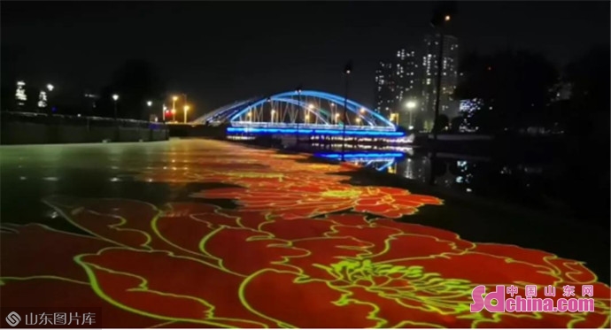 河面、灯光、倒影连成一片,更有美丽炫彩的“牡丹花”在天香公园西侧赵王河太原路段惊艳“绽放”。