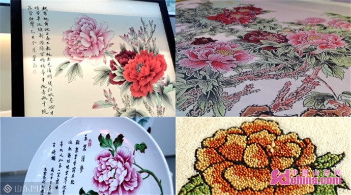 除此之外,还有各式各样的牡丹艺术品。插花牡丹、盆景牡丹、粮画牡丹、国画牡丹、刺绣牡丹、刻瓷牡丹……