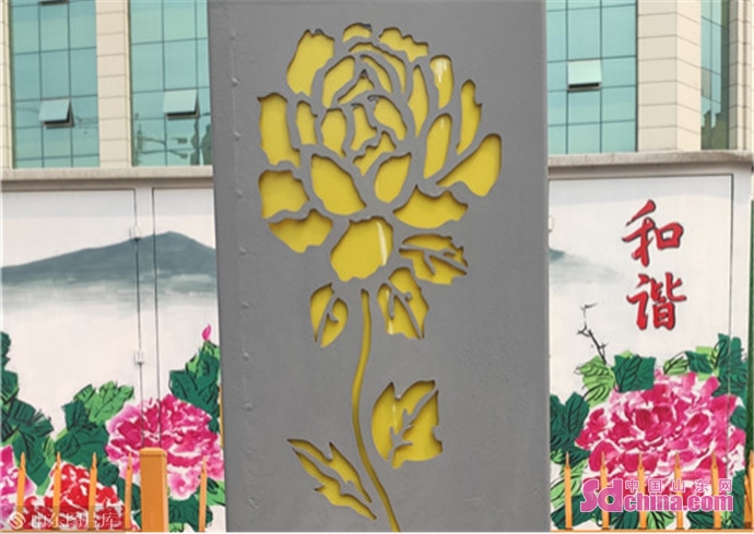 菏泽市有一个牡丹区,牡丹区里有一条“牡丹路”。牡丹路两旁的路灯顶端是牡丹花造型,牡丹路树丛中的配电箱、环网柜上竞相盛开了一朵朵美丽的牡丹花,姹紫嫣红、花团锦簇,远看就像给配电箱、环网柜“穿上”了“牡丹花裙”。