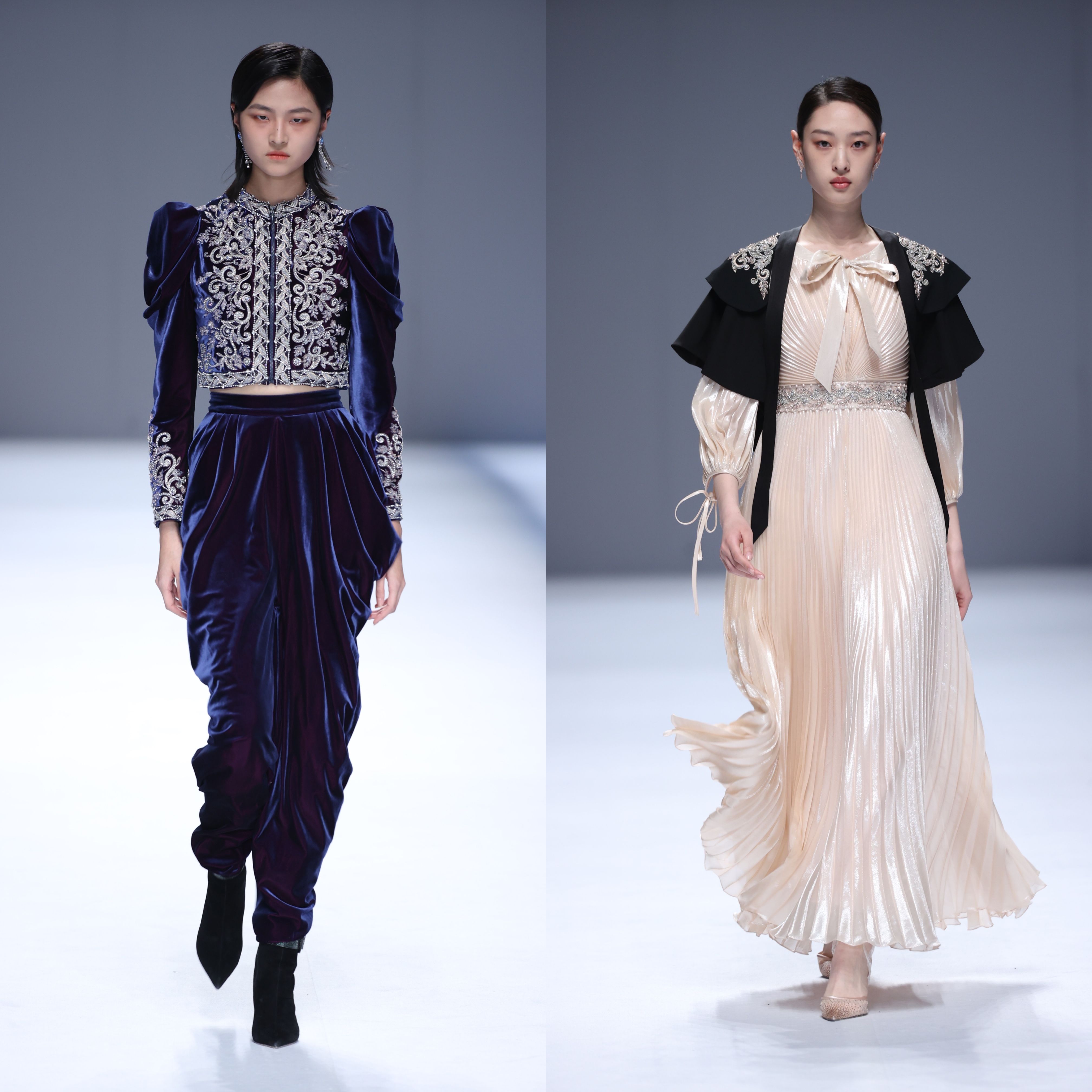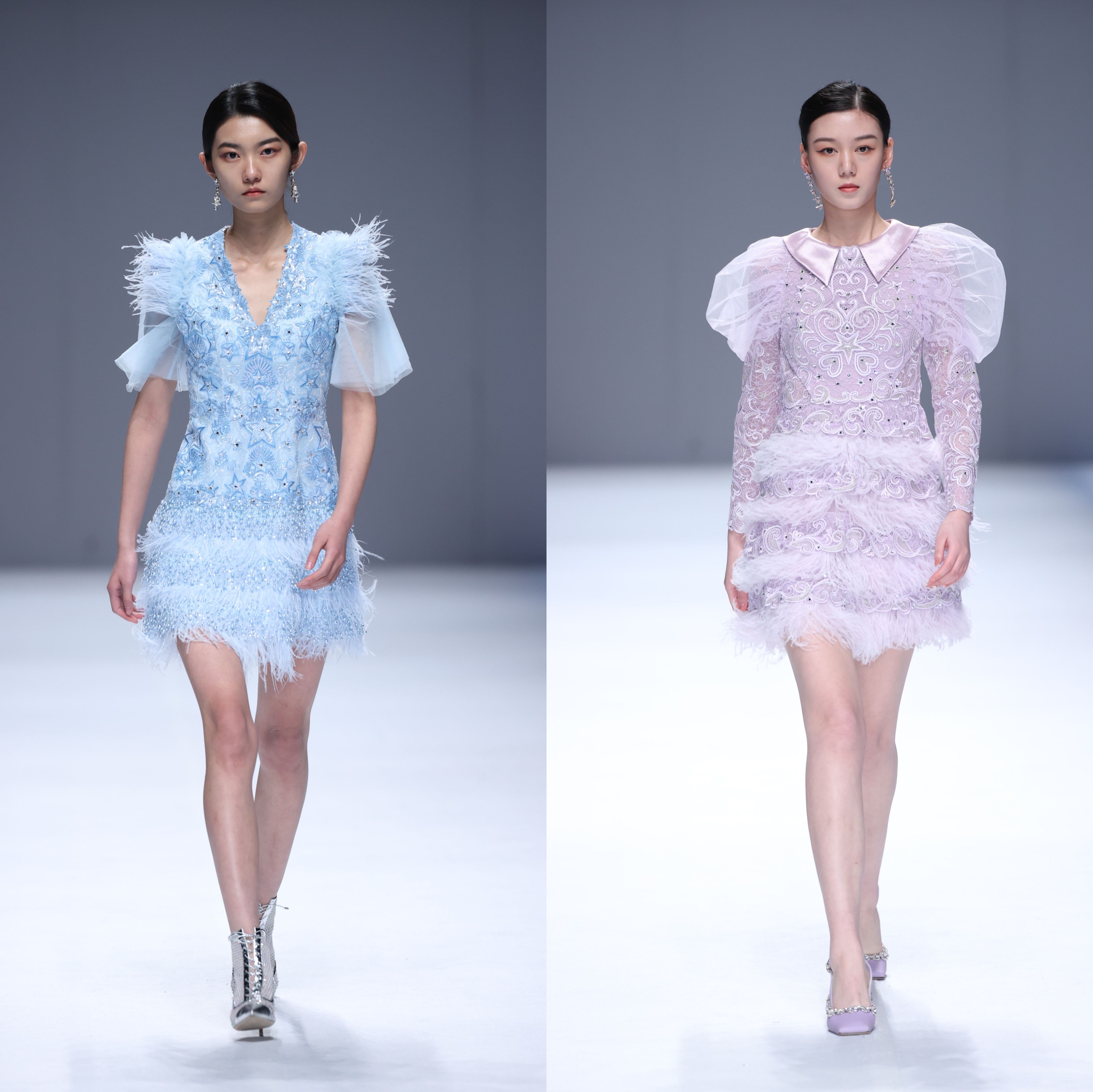 此外,服装上的星形及心形图案是这季的标志性元素,除了采用手工绣珠、羽毛、镶钻和绣花工艺外,还加入了潮绣等非遗工艺。结构上则采用了立体剪裁,利落的廓形,让服装更加贴合人体,整个系列既呈现出欧洲风情,又充满了中式的摩登格调。
