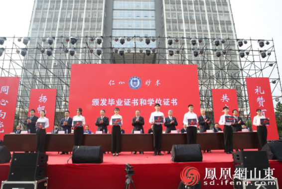 毕业典礼在全场高唱国歌中拉开帷幕。副院长王广成宣读《滨州医学院关于表彰2021届优秀毕业生的通报》。参加典礼的校领导分别为2021届毕业生代表颁发毕业证书和学位证书,为2021届山东省优秀毕业生荣誉称号的同学代表、2021届滨州医学院优秀毕业生荣誉称号毕业生代表颁发证书,为2021届毕业生校友联络员颁发聘书。