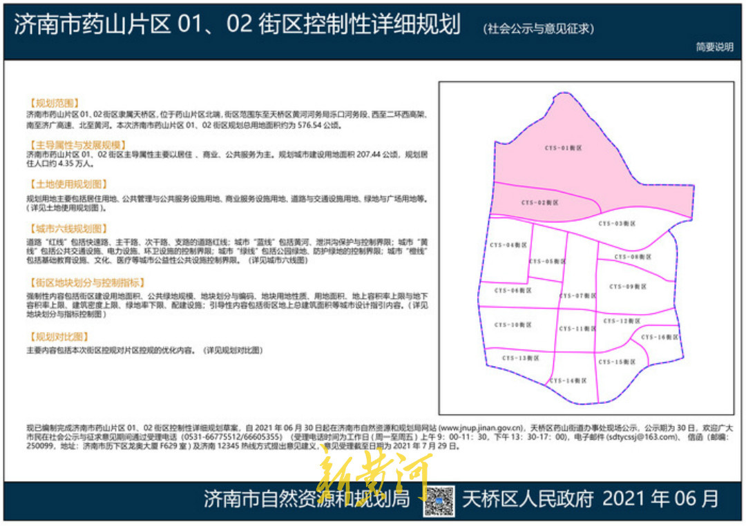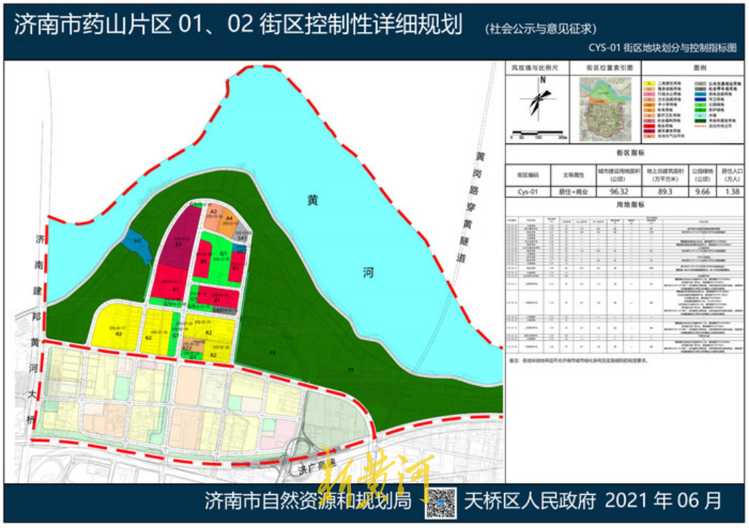 6月30日,济南市自然资源和规划局对药山片区01、02街区控制性详细规划公示。01、02街区位于药山片区北端,东至天桥区黄河河务局泺口河务段,西至二环西高架,南至济广高速,北至黄河。根据控规公示信息,01、02街区规划总用地面积576.54公顷,规划城市建设用地面积207.44公顷,规划居住人口4.35万人。