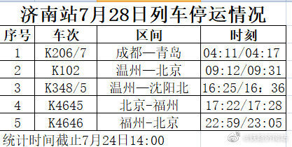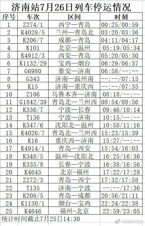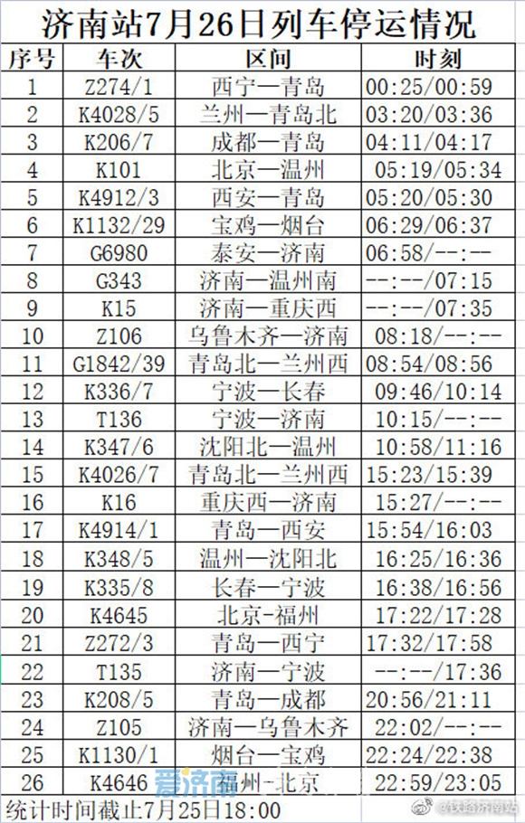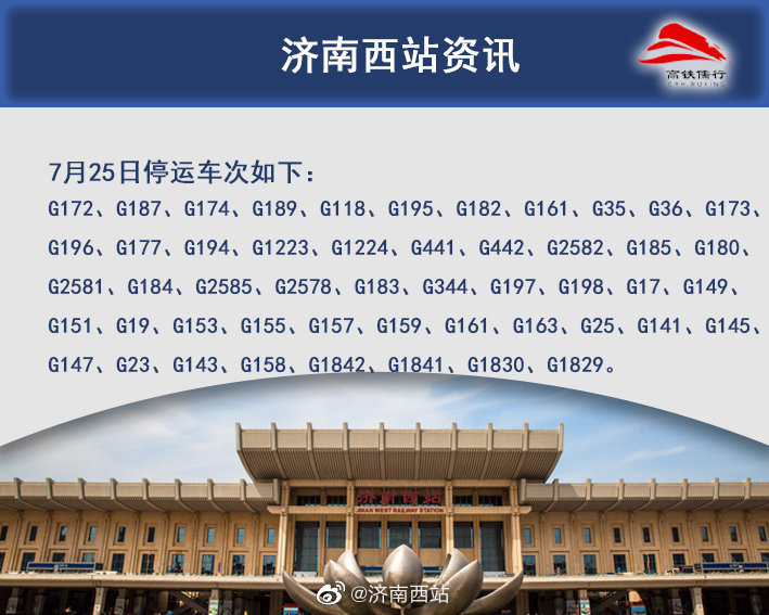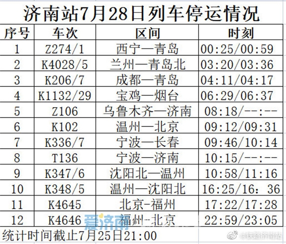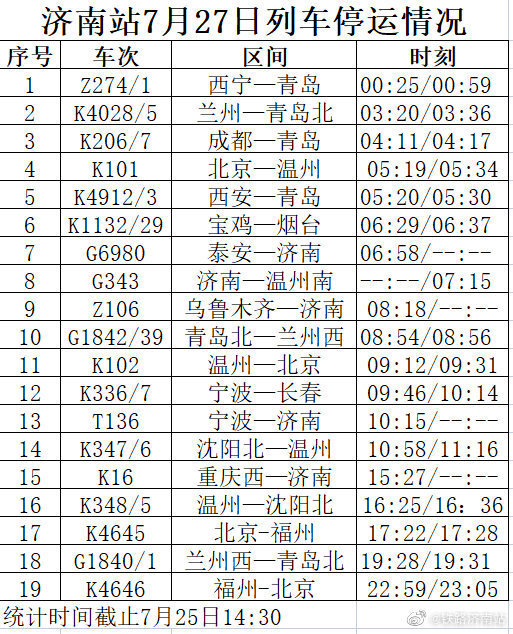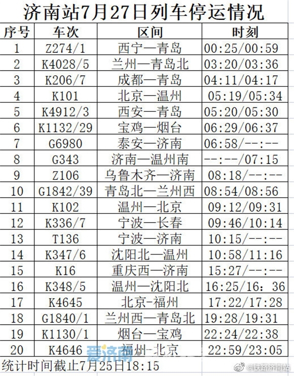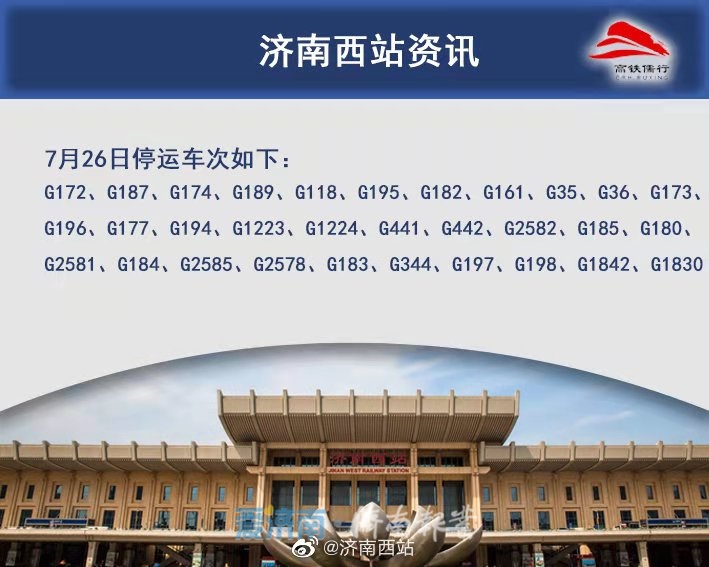 此外,今天下午记者从中铁济南局济南站方面了解到,受河南多地遭遇持续强降雨天气影响及台风“烟花”的影响,济南站7月26日G1842/39青岛北—兰州西、7月27日G1840/1兰州西—青岛北、G1842/39青岛北—兰州西列车停运;济南西站7月25日G172等多趟列车停运。具体如下: