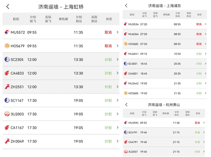 记者从济南机场方面了解到,目前今天济南飞往上海虹桥机场、上海浦东机场的航班已经全部取消,同时有多架次飞往上海、浙江的航班备降济南。记者通过中国民航官方app“航旅纵横”查询发现,今天除济南飞往上海的航班全面取消外,今天济南飞往杭州萧山机场的航班也已经全部取消。通过查询明日上述航班情况,记者看到也有多架次航班处于取消状态,另有部分航班计划执飞,届时具体情况还要以官方最新消息为准。