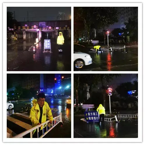 7月29日,凌晨一点菏泽市交警支队开发区大队中华路中队民警夏航、晁笠胜,正在巡查道路,放置安全提示牌,提醒车辆避免涉水。