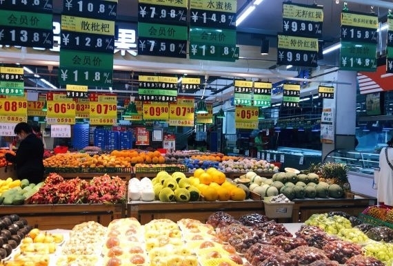 碧绿的青菜、新鲜的水果整整齐齐地摆放着,鲜红圆滚的辣椒、翠绿欲滴的青菜、油亮饱满的茄子……五颜六色、整整齐齐,而且这些蔬菜水果都很新鲜,品质上乘,一看就给人一种高档的感觉。