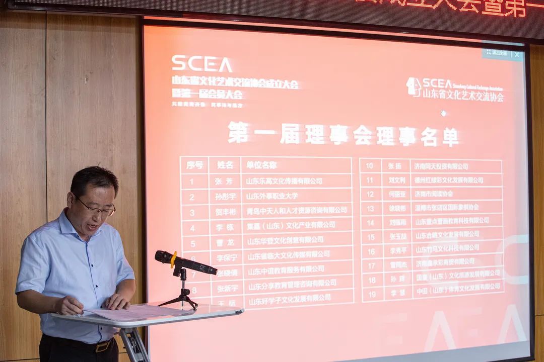 会上介绍了山东省文化艺术交流协会筹备情况,宣读了山东省文旅厅及民政厅“关于同意山东省文化艺术交流协会成立”的相关批复文件。会议表决通过了山东省文化艺术交流协会章程、会费标准及管理办法,选举产生了山东省文化艺术交流协会第一届理事会和协会领导班子,张芳当选为山东省文化艺术交流协会会长,孙彤宇、贺丰彬、李栋、曹龙、李保宁、张晓倩、张新宇当选为副会长,秘书长由副会长张新宇兼任。