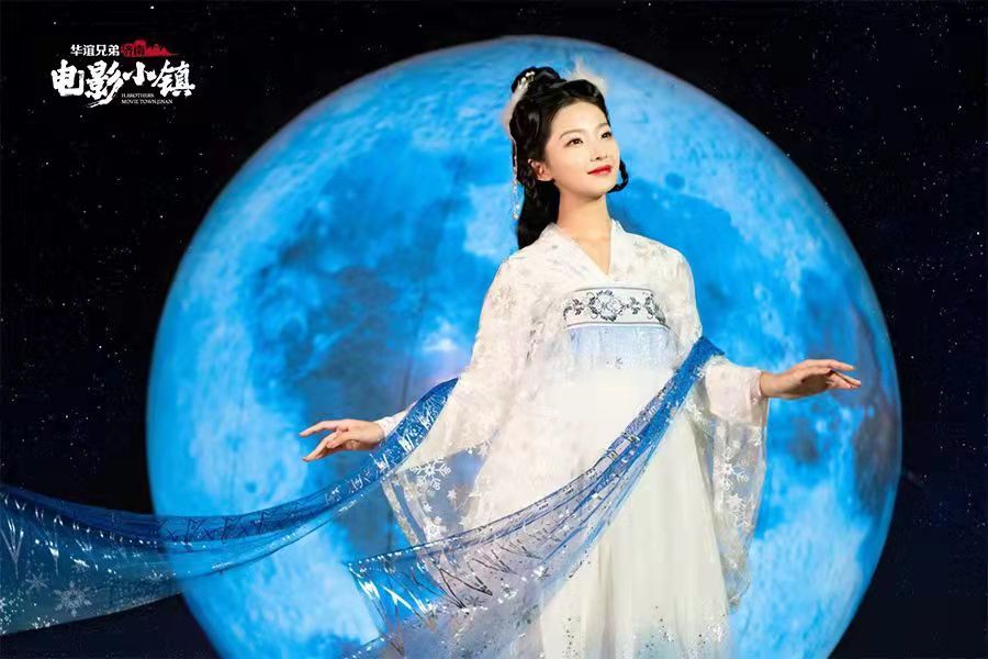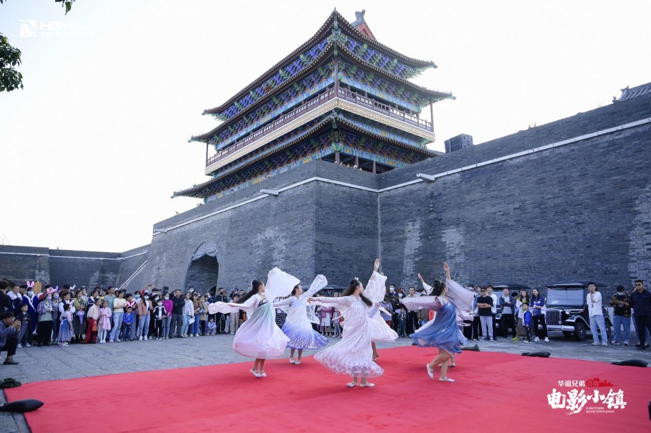 中秋节假日,夜游电影小镇,感受时代风华。夜晚上演的大型灯光投影秀,在高大的城墙上投射出绚丽多彩的灯光,光影变幻无穷,似携众人穿越时空逐梦光影;妆容精致、身着旗袍的女演员们在光影映照下为游客献上精彩舞蹈表演,舞姿柔美、光彩照人;身着马褂的帅气男演员们依次登场表演,再现华谊兄弟影视精彩瞬间。电影小镇内沿街叫唱的报童、商贩,亦是这幅国潮画卷里的精彩元素,游客们跟随音乐的律动,开启狂欢之夜,小镇活力四射。