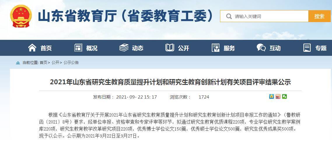 2021年山东省研究生教育质量提升计划和研究生教育创新计划有关项目评审结果近日公示,拟通过研究生教育优质课程220项,专业学位研究生教学案例库220项,研究生教育教学改革研究项目220项,优秀博士学位论文150篇,优秀硕士学位论文500篇,研究生优秀成果奖500项。公示期为2021年9月22日至9月27日。