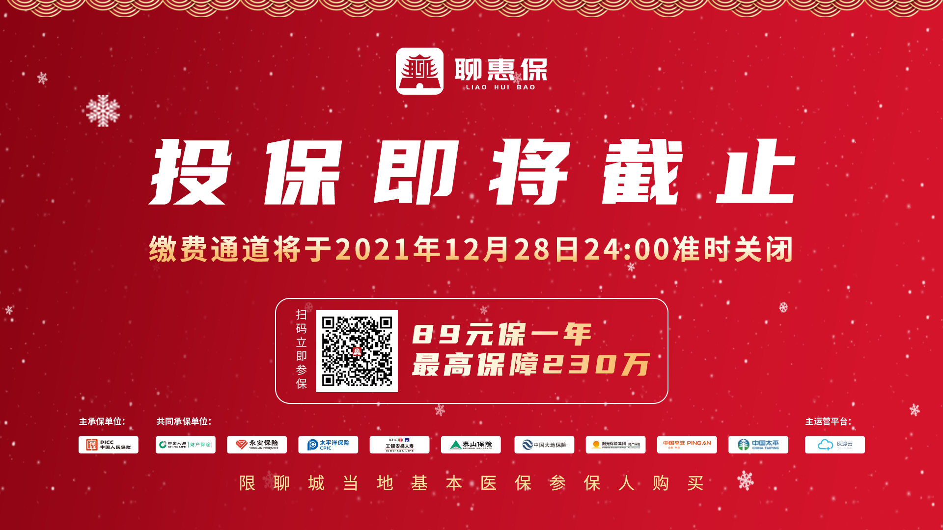 聊城普惠性商业补充医疗保险“聊惠保”参保已进入尾声,本年度参保通道将在明天(12月28日)24时关闭,投保期仅剩最后不到32小时。