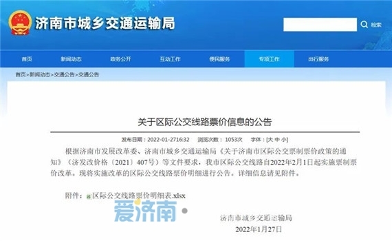 根据济南市发展改革委、济南市城乡交通运输局《关于济南市区际公交票制票价政策的通知》(济发改价格〔2021〕407号)等文件要求,我市区际公交线路自2022年2月1日起实施票制票价改革。现将实施改革的区际公交线路票价明细进行公告。