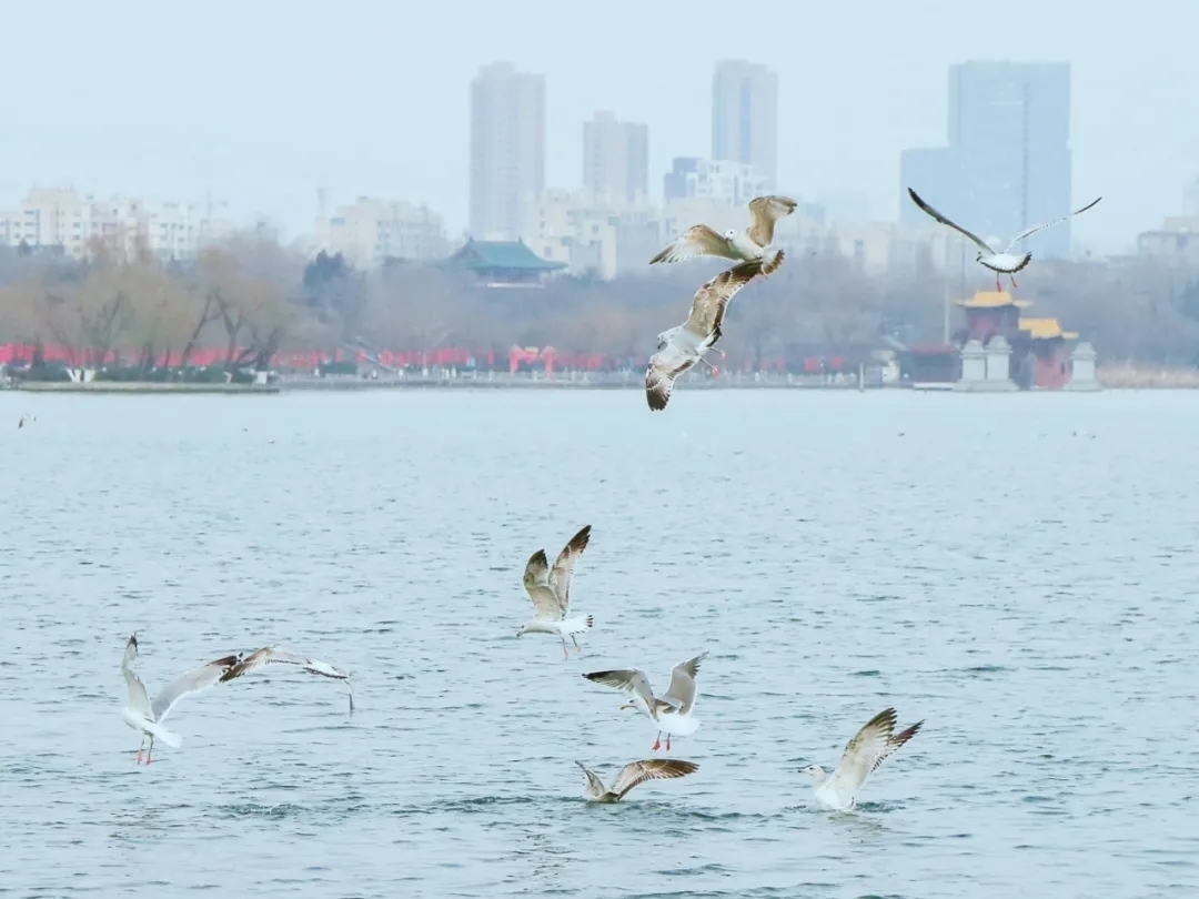 此时的大明湖春意萌动,珍稀的西伯利亚银鸥也来了,翔集在大明湖水面上翩翩起舞。