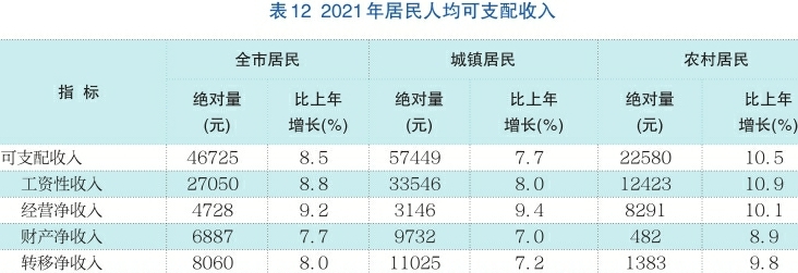 居民收入稳定增长。全年居民人均可支配收入46725元,比上年增长8.5%。其中,城镇居民人均可支配收入57449元,增长7.7%;农村居民人均可支配收入22580元,增长10.5%。居民人均消费支出30016元,增长8.4%。其中,城镇居民人均消费支出36866元,增长7.2%;农村居民人均消费支出14591元,增长12.7%。城乡居民收入比由上年的2.6:1缩小至2.5: 1。城镇居民恩格尔系数为[14]23.5%,农村居民恩格尔系数为30.5%。