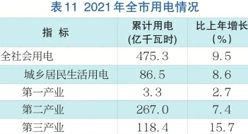 全社会用电稳步增长。全年全社会用电475.3亿千瓦时,增长9.5%。其中,居民生活用电86.5亿千瓦时,增长8.6%。分产业看,第一产业用电3.3亿千瓦时,增长2.7%;第二产业用电267.0亿千瓦时,增长7.4%;第三产业用电118.4亿千瓦时,增长15.7%。工业用电256.6亿千瓦时,占全社会用电量比重为54.0%,增长7.1%。