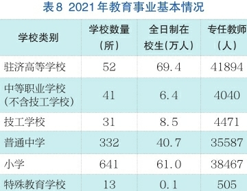 卫生服务水平不断提升。年末拥有卫生机构7530个,比上年增加16个,其中,医院、卫生院338个。卫生机构床位7.3万张,增长5.7%。各类卫生技术人员10.8万人,增长5.8%;执业(助理)医师4.2万人,增长5.3%。稳妥有序推进新冠病毒疫苗接种,全年累计接种2042.3万剂次,覆盖878.3万人。