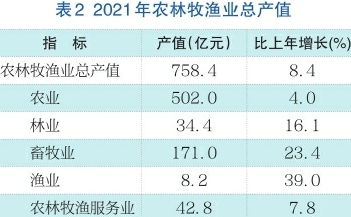 农业稳步增长。全年农林牧渔业总产值758.4亿元,比上年增长8.4%。其中,农业总产值502.0亿元,增长4.0%;畜牧业总产值171.0亿元,增长23.4%。农林牧渔业增加值427.9亿元,增长7.1%。
