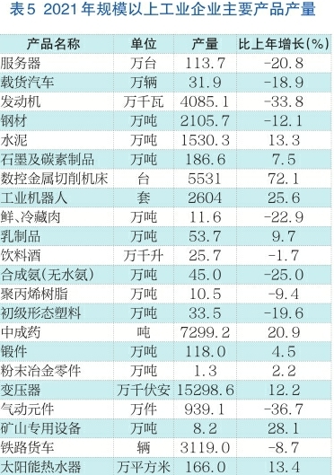 工业产品供应充足。全年规模以上工业产品产销率为97.4%。所生产的296种工业产品中,有181种产品产量实现增长,增长面为61.1%。其中,增幅超过20%的产品有82种,占比为27.7%,比上年提高1.7个百分点。光纤、集成电路、液晶显示屏实现1倍以上增长,数控金属切削机床、光缆、充电桩产量实现50%以上增长。
