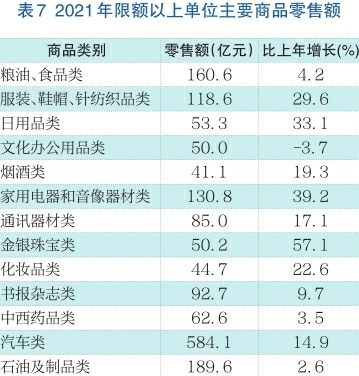 基本生活类消费保持稳定。限额以上单位商品零售额中,粮油食品类商品全年实现零售额160.6亿元,比上年增长4.2%;服装鞋帽针纺织品类商品实现零售额118.6亿元,增长29.6%;日用品类商品实现零售额53.3亿元,增长33.1%。