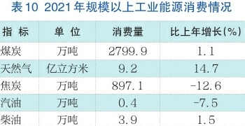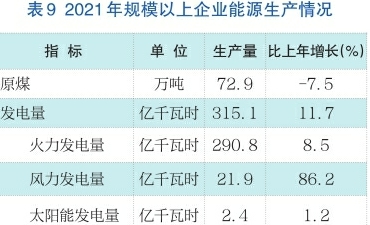 能源转型和绿色低碳发展初见成效。清洁能源消费占比逐步提高,全年规模以上工业煤炭消费2799.9万吨,比上年增长1.1%,天然气消费9.2亿立方米,增长14.7%。新能源发电占比稳步提升,发电结构深度调整,风力发电、垃圾发电、生物质发电均有显著提高,火力发电量占发电总量比重比上年下降2.7个百分点。规模以上企业风力发电21.9亿千瓦时,占发电总量比重为7.0%,增长86.2%;垃圾发电9.5亿千瓦时,占发电总量比重为3.0%,增长37.7%;生物质发电5.1亿千瓦时,占发电总量比重为1.6%,增长86.2%。