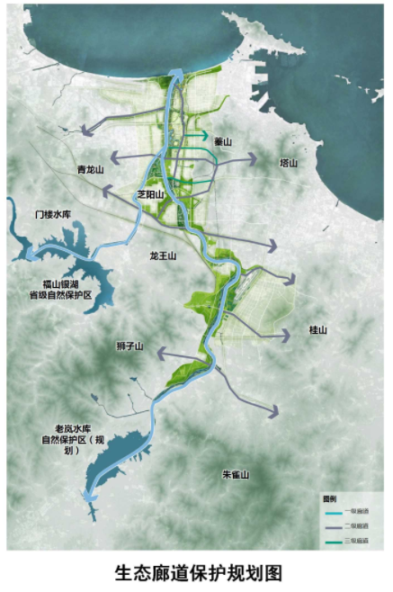 构建由山到海的空间骨架,彰显营城特色,规划结合自然人文特色与发挥意图,重点打造夹河入海口、柳子河口、宫家岛、夹河岛、太平顶等一级锚点,强化山川天阙骨架,构建完整的一主三辅山海轴线体系。