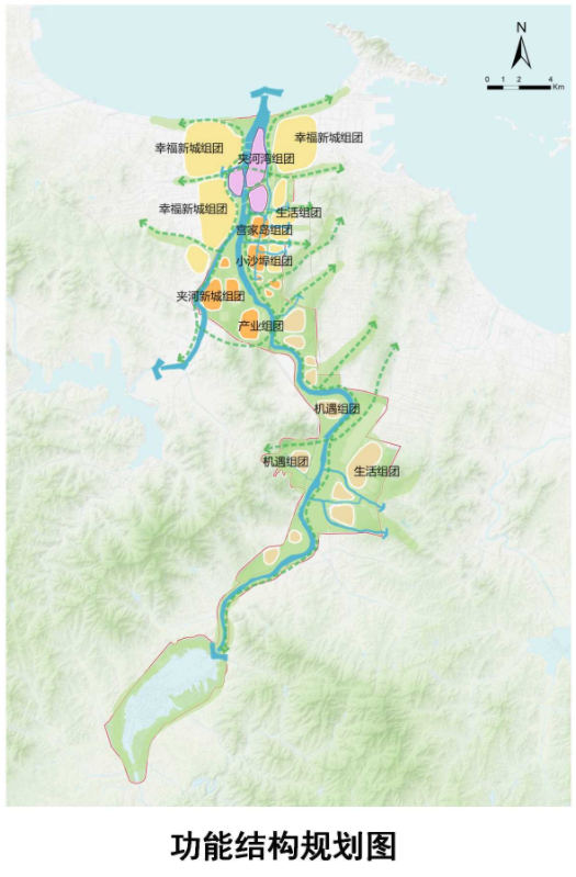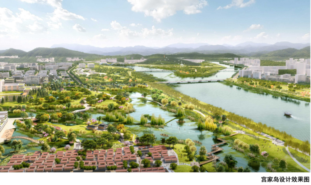 塑造繁华都市到悠然山谷的人间仙境:设计通过对地方空间研究,挖掘出港、洲、滩、岛、林、丘、湾、谷等仙境河谷要素。而机遇组团、宫家岛组团、夹河湾组团等如何成体系布局,将成为夹河升级最大的关注点。