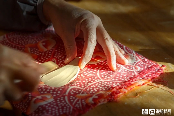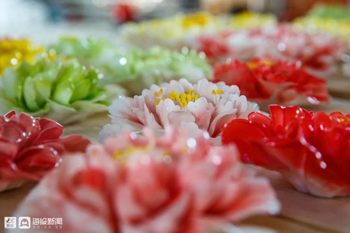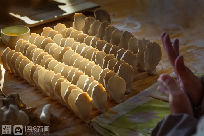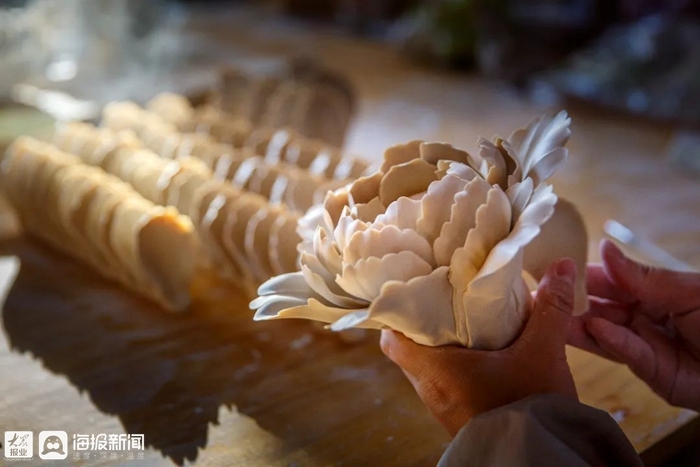 一块块泥坯,在捏花师傅的手里腾挪转换,按压掐捏,不一会儿就变成了一片片素色的牡丹花瓣。
