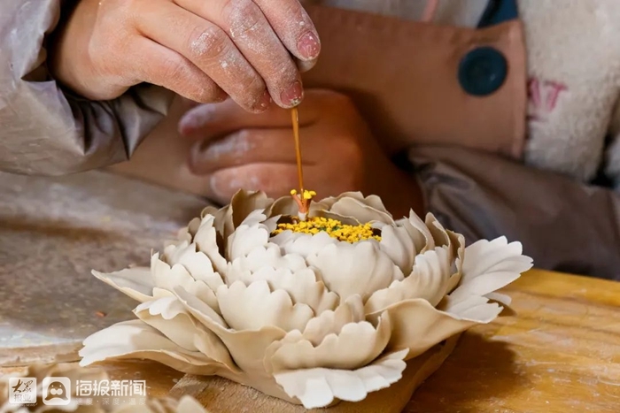 嵌蕊。用细小工具填充黄色花蕊,菏泽牡丹瓷素坯成型。