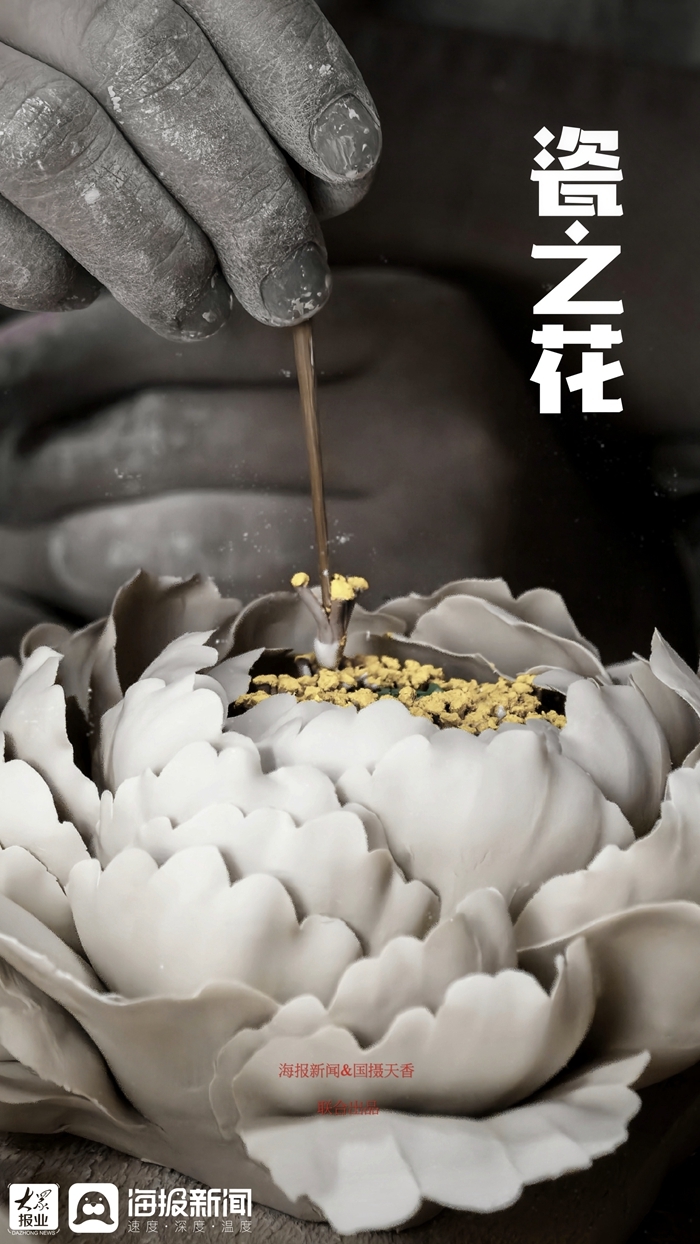 拈花。牡丹瓷花瓣采用中国有着“白如雪,润如玉”美誉的白瓷土为制作材料,纯手工拈花而成。