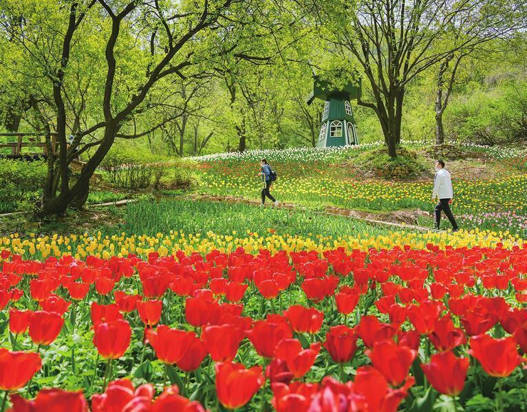 4月23日,恰逢周末,正常开园的济南红叶谷景区花开正艳,这里已经变成了郁金香的海洋。由于花期晚于市区,欧洲风情谷内50多个品种上百万株郁金香正值最佳观赏期,仿佛让人置身于美丽的童话世界,流连忘返于南部山区的秀美春色中。