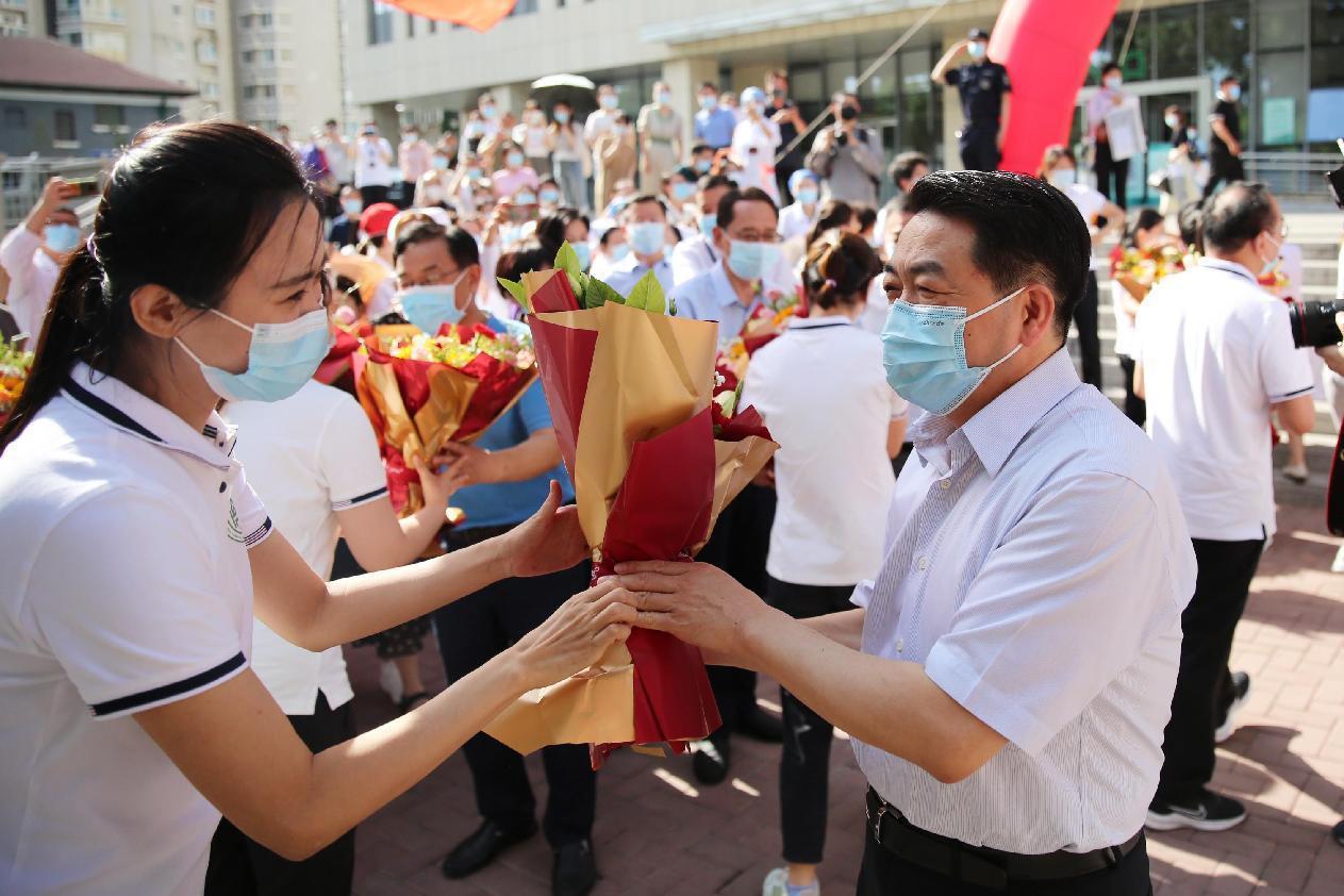 6月7日下午,山东大学齐鲁医院援沪医疗队员正式解除医学观察平安凯旋,医院举行仪式欢迎队员们胜利归来。党委书记侯俊平出席仪式并讲话,院长陈玉国主持欢迎仪式。