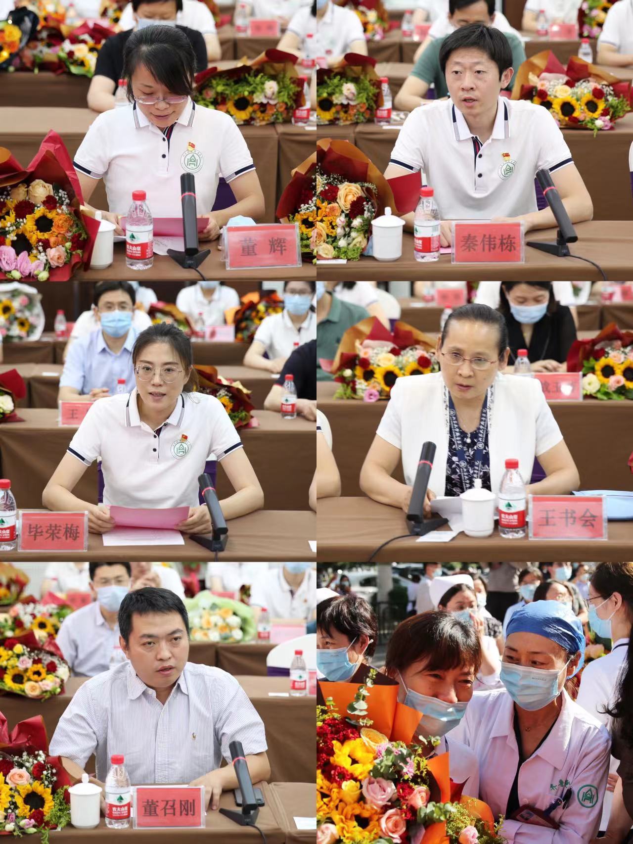 仪式上,援沪医疗队领队、医务处副处长董辉,援沪医疗队队长、重症医学科主任助理秦伟栋,援沪医疗队副队长、普通外科主管护师毕荣梅,外派院感指导专家、医院感染管理处院感监测科科长王书会,外派检验指导专家、检验科主任助理董召刚作交流发言。大家从不同角度,分别介绍了代表医院支援抗疫的相关工作情况,分享了自己在抗疫一线的亲身经历和感受。援沪队员们纷纷表示,此次援沪工作是一段光荣而艰巨的征程,感谢医院大后方的关心慰问和后勤保障,感谢战友们两个月来的团结协作和同舟共济。回归工作岗位后,将继续弘扬“生命至上、举国同心、舍生忘死、尊重科学、命运与共”的伟大抗疫精神,担当作为、履职尽责,为争当公立医院高质量发展排头兵作出更大贡献。