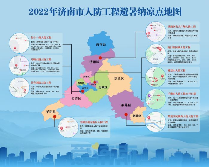 全市9处具备条件的人防工程避暑纳凉点分别为:经十一路英雄山人防工程、经十一路银座马鞍山人防工程、南门“韩国城”人防工程、佛慧山515人防工程、千佛山人防工程31号口部(威龙酒窖)、市中区共青团路人防工程、济阳区安大城市广场人防工程、莱芜区凤城西大街人防工程、平阴县锦东新区人防工程。为方便市民找到具体位置,市人防办专门制作了《2022年济南市人防工程避暑纳凉点地图》,可以通过市人防办官方网站察看。