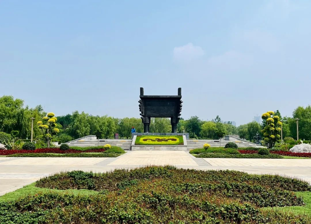 来到湖畔边,初见鼎湖广场已建成,“鼎”立于广场中间,气势磅礴。据樊桂伟介绍,此为任城宝鼎,重8吨,高5.08米、长4.64米、宽3.2米,有八方平安,五谷丰登的美好寓意。该鼎为青铜铸造,长方四足,正面为篆体“任城宝鼎”四字。