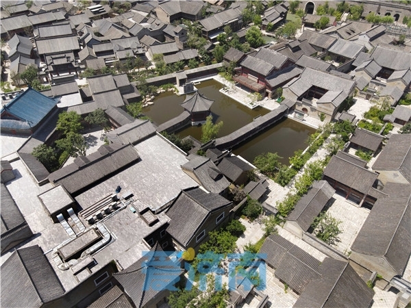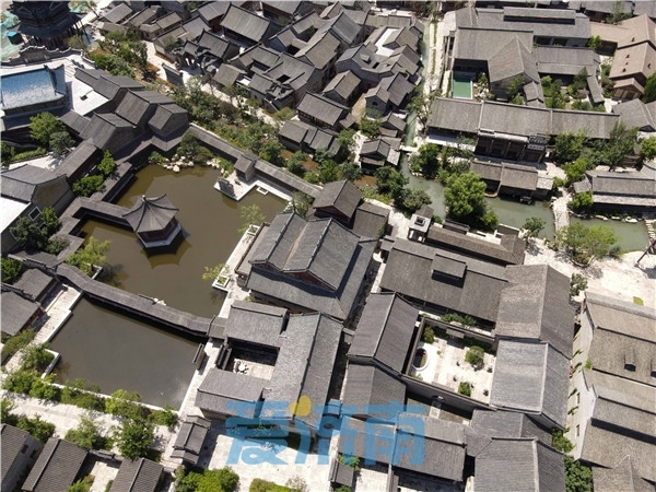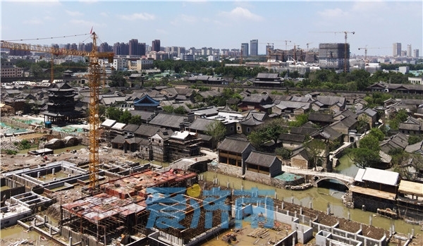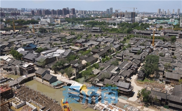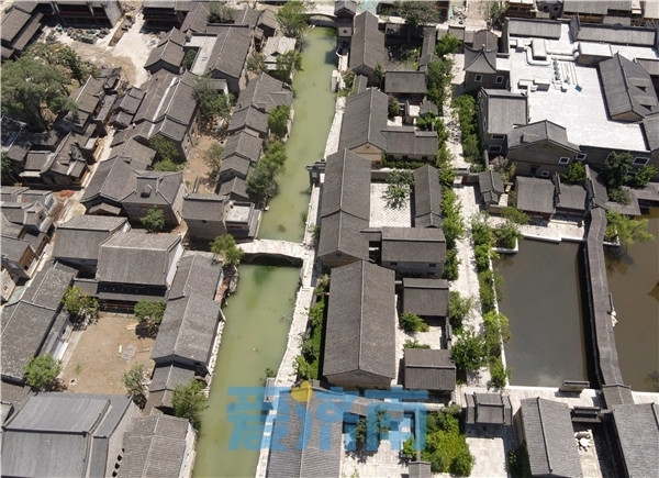 7月9日航拍的正在建设中的明水古城。初具规模的明水古城典雅古朴,新建的城门楼、亭台楼阁和仿古街区全部以明清时期建筑风格为主,砖楼青瓦,古街石巷和星罗棋布的池塘流水,牌坊,构成壮丽的图画。
