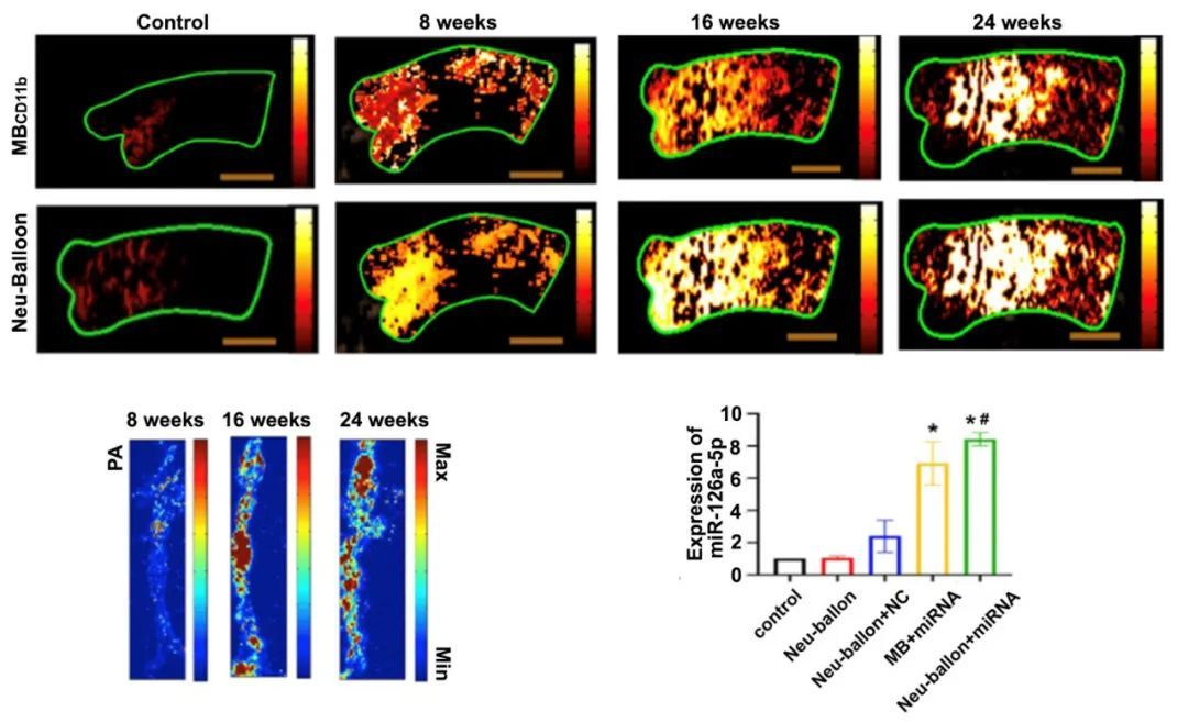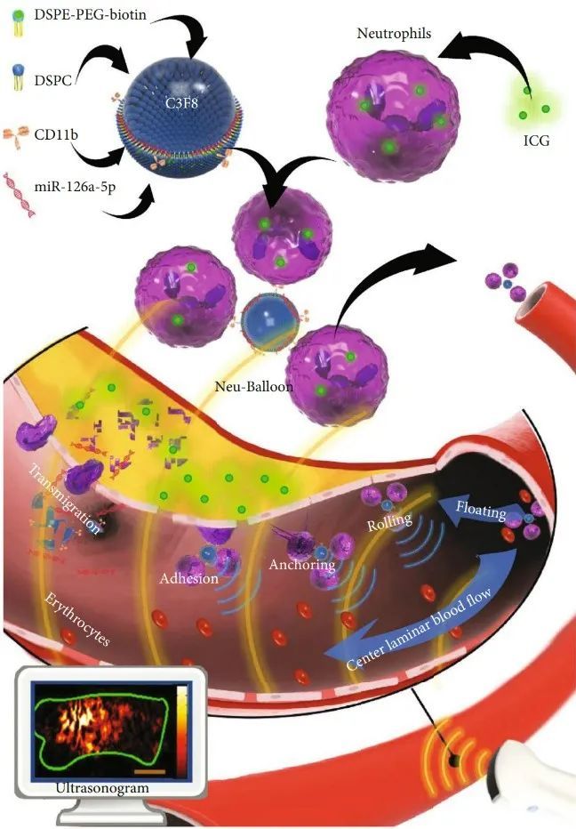 在该工作中,为了对动脉粥样硬化易损斑块进行靶向干预,研究人员构建了中性粒细胞-微泡复合体,即Neu-balloon。该复合体由微泡与中性粒细胞连接而成,使这两种药物输送载体的作用相互加强。在靶向方面,在超声场的作用下,微泡可拖动中性粒细胞离开高速轴流到外周层流,促进中性粒细胞与动脉壁的相互作用。然后中性粒细胞以仿生的方式携带荷载物进入炎性状态的内皮细胞下。超声场和超声靶向微泡破坏(UTMD)效应不影响中性粒细胞活性。为了验证Neu-balloon在高剪切力环境下的炎症趋化作用,本研究首先应用TNF-α+oxLDL刺激小鼠主动脉内皮细胞,建立模拟炎症和高胆固醇致动脉粥样硬化环境的炎症细胞模型,结果显示Neu-balloon对炎症细胞有较强的趋化粘附能力。此外,在静态或高剪切力的环境下,Neu-balloon对炎症刺激内皮细胞的粘附能力明显高于对照组。中性粒细胞分离自ApoE-/-小鼠外周血细胞,在高胆固醇和炎症反应的刺激下,这些中性粒细胞将定位并转运至斑块中,发挥对抗内皮损伤的作用。Neu-balloon通过微泡的声增强,可以应用超声进行追踪观察,同时通过UTMD效应使其荷载的靶向药物进入到斑块内。体内实验中,高脂喂养ApoE-/-小鼠8周、16周、24周,将Neu-balloon尾静脉注入小鼠体内,结果显示,斑块易损指数与小鼠主动脉弓声学强度呈正相关,表明在主动脉内高剪切力环境下,Neu-balloon可随炎症反应的发生而富集。