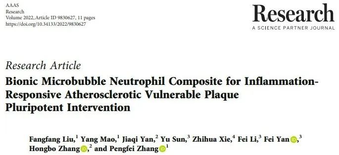 2022年6月3日,山东大学齐鲁医院教育部和国家卫健委心血管重构与功能研究重点实验室张鹏飞教授、芬兰Åbo Akademi大学生物科学中心张宏博教授和中国科学院深圳先进技术研究院严飞研究员团队在Research(最新影响因子11.036)上发表题为“Bionic Microbubble Neutrophil Composite for Inflammation-responsive Atherosclerotic Vulnerable Plaque Pluripotent Intervention”的论文,研发出一种新型易损斑块靶向干预载体。