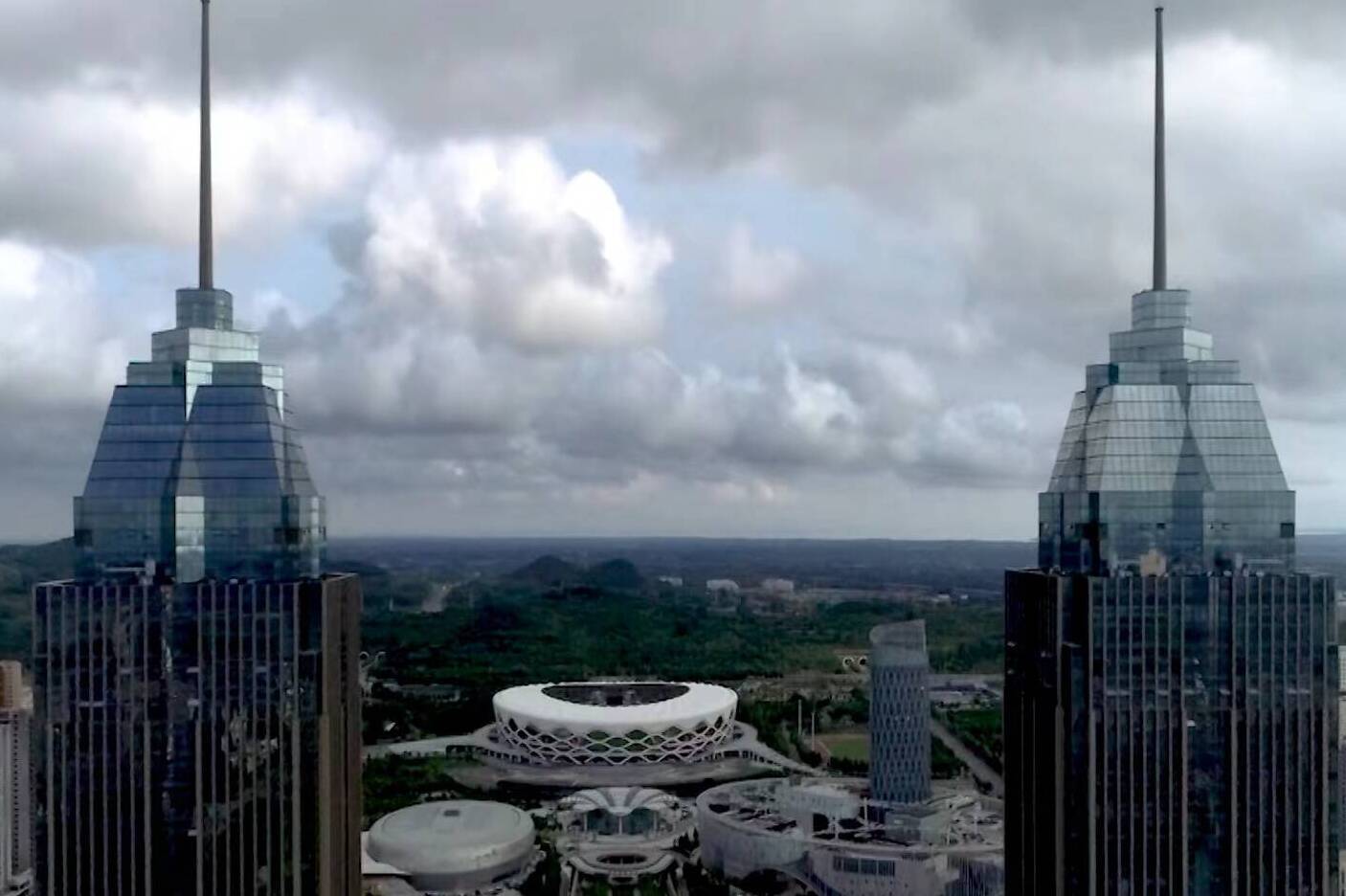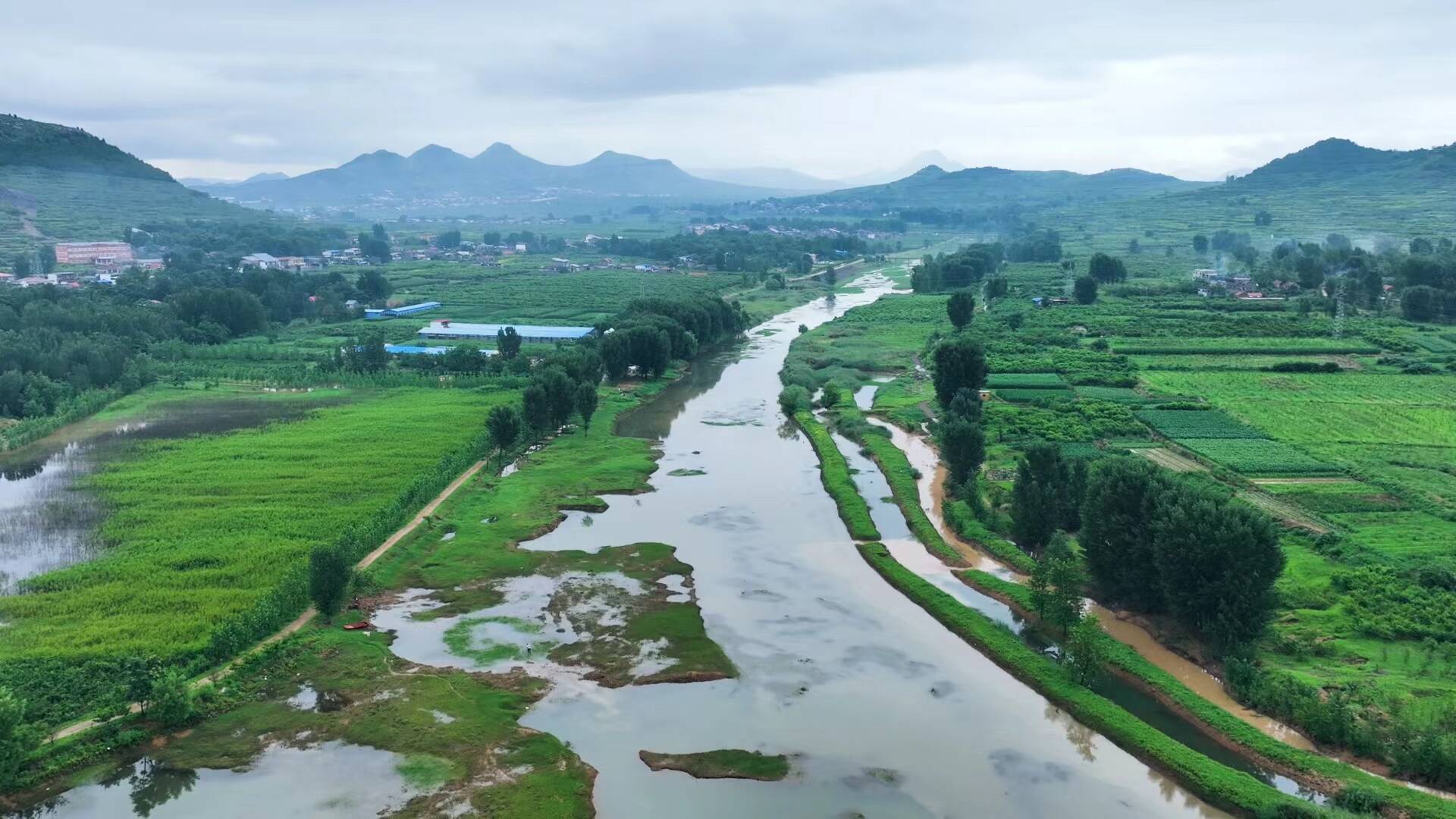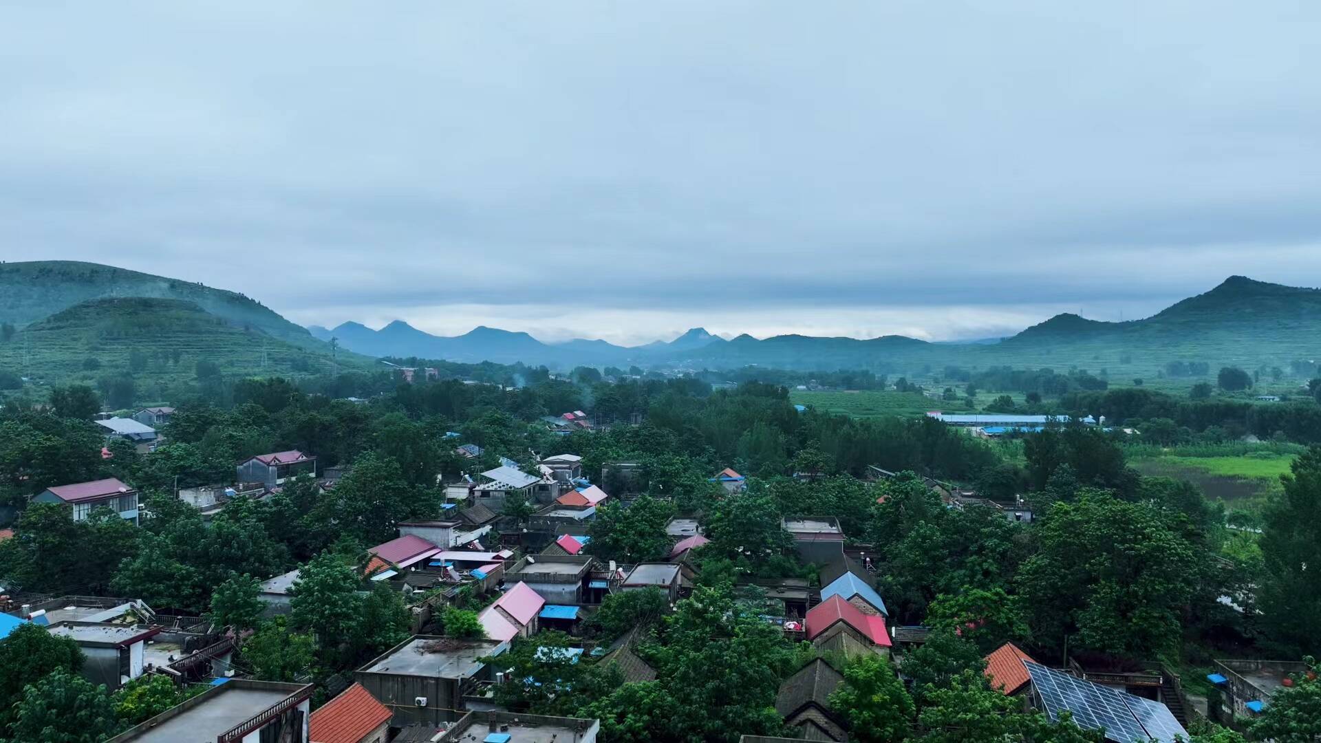 午后,天空中的阴云逐渐消散,雨过天晴,一朵朵白云在太阳光的映射下点缀枣庄的上空,透过天空中飘荡的云海,鸟瞰山峦、河流、村庄、道路、树木,美景如画。