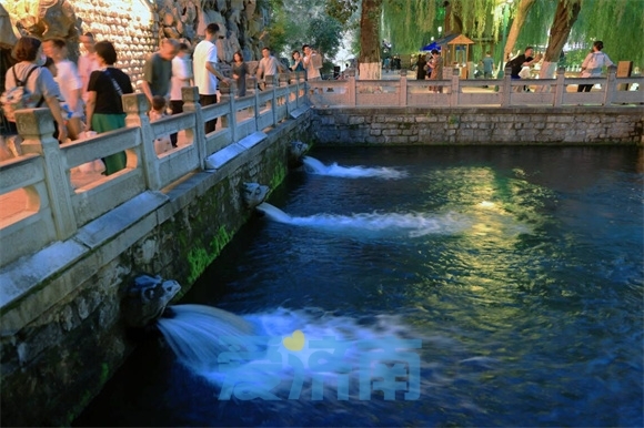 7月14日晚,在黑虎泉群护城河畔,璀璨的灯光下喷涌的名泉演绎着泉水叮咚的美妙乐章;宽厚里人潮涌动,烟火气浓郁。