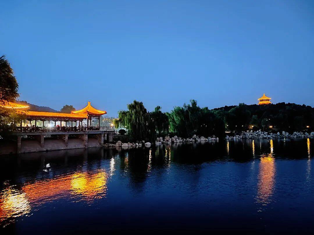 落日余晖后,华灯初上,在璀璨的灯光下,公园的一切都被染上了金色的光影,各色灯光肆意在夜色中流淌,明亮的灯带勾勒出建筑的肌理,散发出属于虎山公园独有的浪漫。