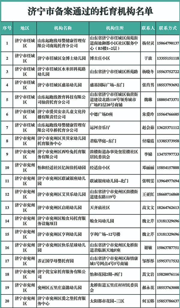 对不少家有3岁以下宝宝的父母而言,常会为孩子该交给谁照顾的问题头疼,这时能选择到一个放心称心的托育机构就格外重要。截至目前,济宁市共有196家托育机构通过备案,现将最新的名单和详细信息公布如下,家长们快来看看有没有你家附近的。