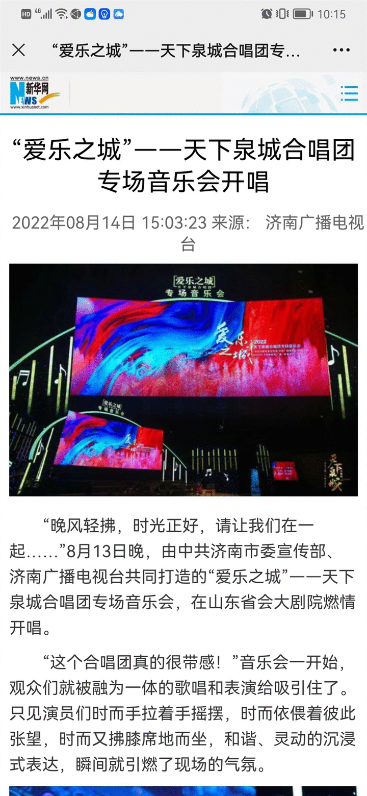“来到现场很震撼,感觉时间过得好快!济南有这么一支高水平的合唱团,感到很自豪!“市民胡女士一口气说出了五六首给自己留下深刻印象的曲目,”希望能够经常举办这样的演出,让我们能有视觉和听觉的享受。”