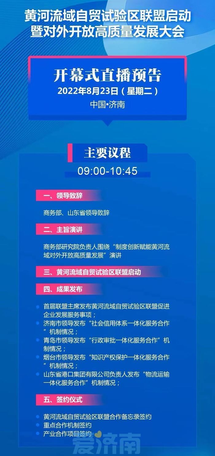 8月23日上午,将在山东大厦金色大厅召开黄河流域自贸试验区联盟启动暨对外开放高质量发展大会主题大会,会上商务部研究院院长顾学明将围绕制度创新赋能黄河流域对外开放高质量发展作主旨演讲。商务部领导和沿黄9省(区)副省长(副主席)将共同启动黄河流域自贸试验区联盟。大会还将发布“黄河流域自贸试验区联盟促进企业发展服务事项”等系列成果以及黄河流域自贸试验区联盟合作备忘录、公共信用评价一体化服务合作、行政审批一体化服务合作等系列项目签约仪式。