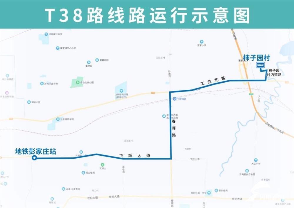 T38路由柿子园村开往地铁彭家庄站,途经柿子园村内道路、工业北路、春晖路、飞跃大道,沿途设置柿子园村、柿子园村南、五里堂村、曹家庄、卫东村、十里堡东、春晖路科嘉路、吉利汽车、飞跃大道春晖路、信息通讯产业园、飞跃大道春暄路、武家庄、地铁彭家庄站站点。