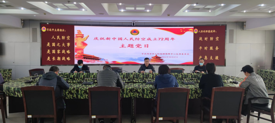 为热烈庆祝新中国人民防空创立72周年,菏泽市人防指挥保障中心党支部于10月27日上午,在市人防办六楼会议室组织开展“庆祝新中国人民防空创立72周年”主题党日活动。活动由市人防指挥保障中心党支部书记卢凤礼同志主持,指挥保障中心全体党员参加。
